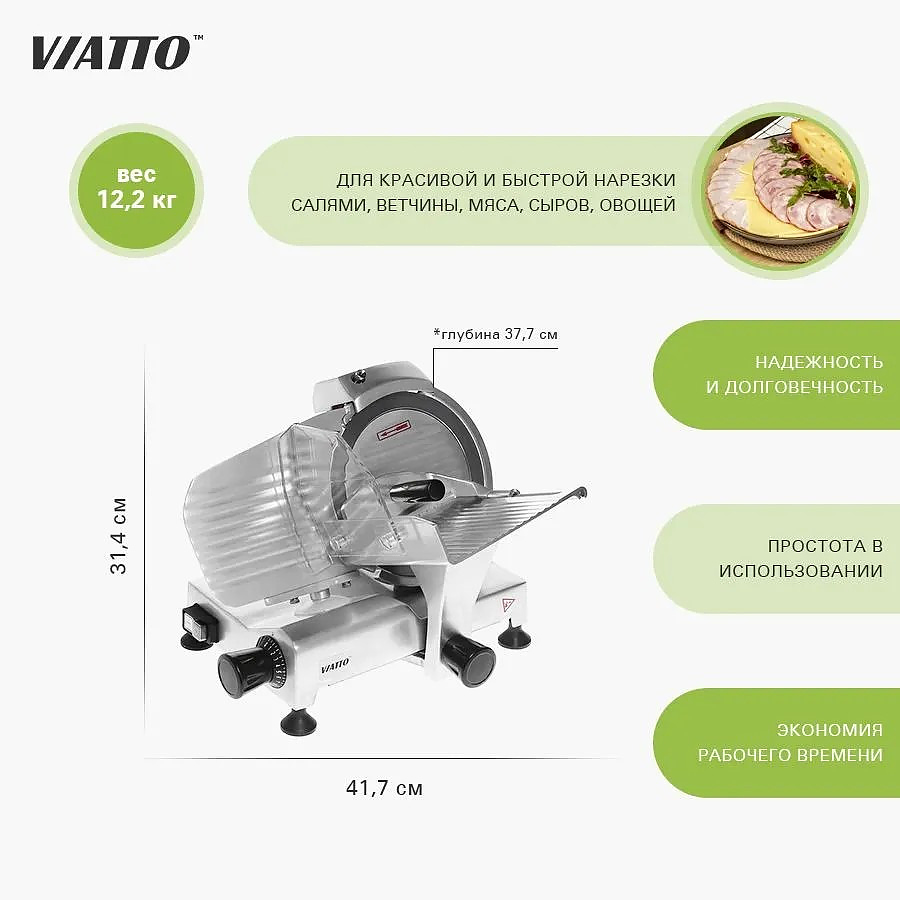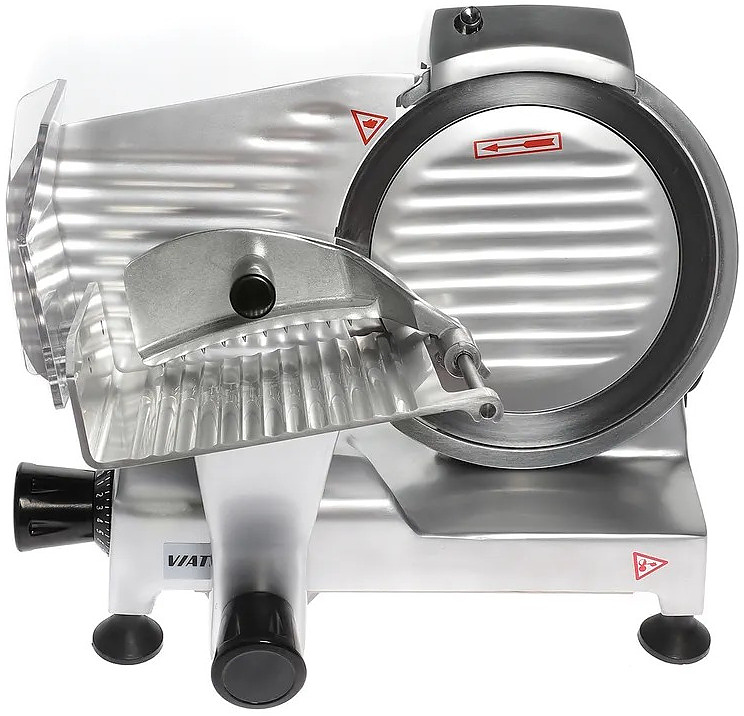 Слайсер VIATTO HBS-195JS предназначен для нарезки равными ломтиками приготовленного мяса, колбасных изделий, сыра и овощей на предприятиях общественного питания, торговли и пищевых производствах. Модель оснащена затачивающим устройством, прикрепленным на каретку. Материал корпуса - алюминиевый сплав.