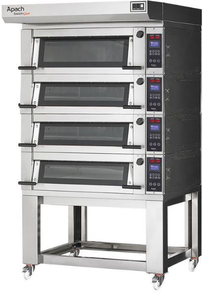Печь подовая Apach Bakery Line E2K5L DPBI-T серии E используется на предприятиях общественного питания, торговли, пищевых производствах, в пекарнях и кондитерских для приготовления различных блюд, выпечки хлебобулочных и кондитерских изделий. Модель оборудована цифровым управлением с раздельным контролем температур: верх/низ, вытяжкой пара, соединительным комплектом для воды и электричества, дверью со смотровым окном и подставкой на колесах. Материал козырька, подставки и корпуса - высококачественная нержавеющая сталь, материал основания - цементный агломерат с металлическим каркасом, материал теплоизоляции - минеральная вата.