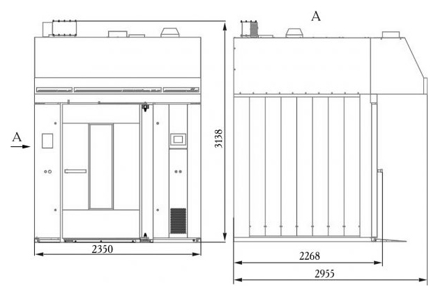 - Проем двери, дверь, основание, платформа, потолок, профили пояса, стойки и патрубок: 2470х2250х1020 мм