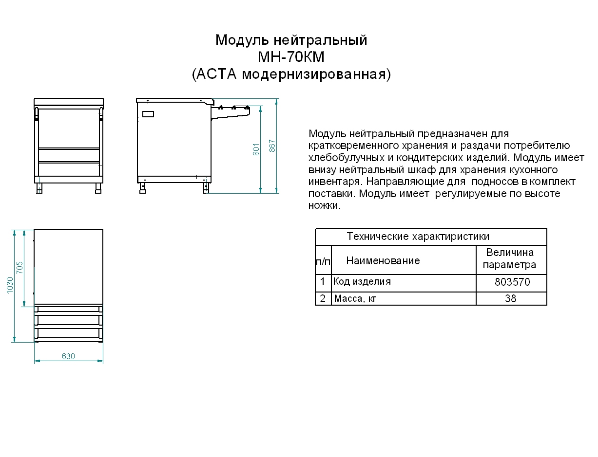 Нейтральный модуль​ Abat МН-70КМ предназначен для выкладки хлебобулочных, кондитерских изделий, посуды и столовых приборов в составе линий раздач на предприятиях общественного питания и торговли. Ножки регулируются по высоте. Материал изделия - нержавеющая сталь.