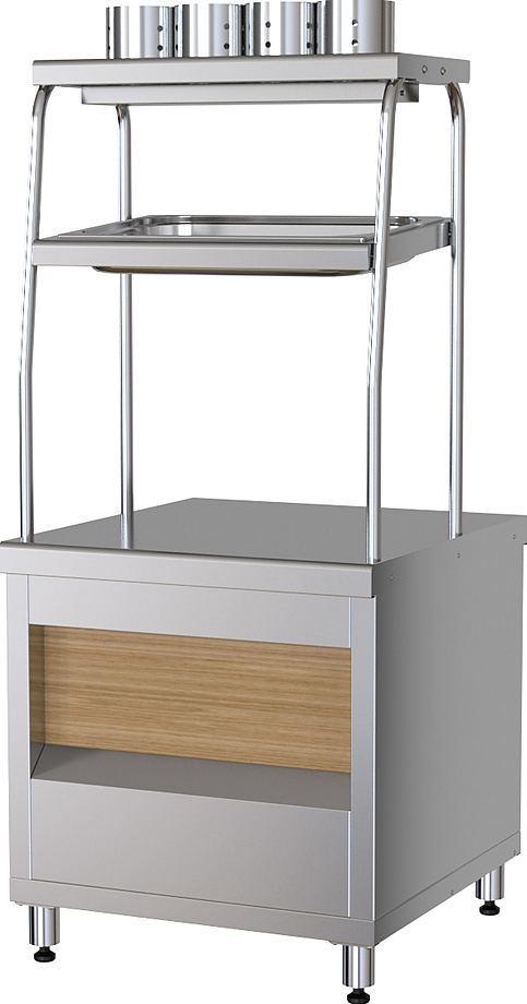 Прилавок столовых приборов Марихолодмаш ППСХ6 используется в составе линии раздачи ШЕФ 1500 и Шеф 1120 для демонстрационной выкладки и кратковременного хранения различных блюд, напитков, кондитерских, хлебобулочных изделий и посуды на предприятиях общественного питания, торговли и пищевых производствах. В модели предусмотрена полка для стаканов и хлебница. Материал корпуса и стаканов - высококачественная нержавеющая сталь.