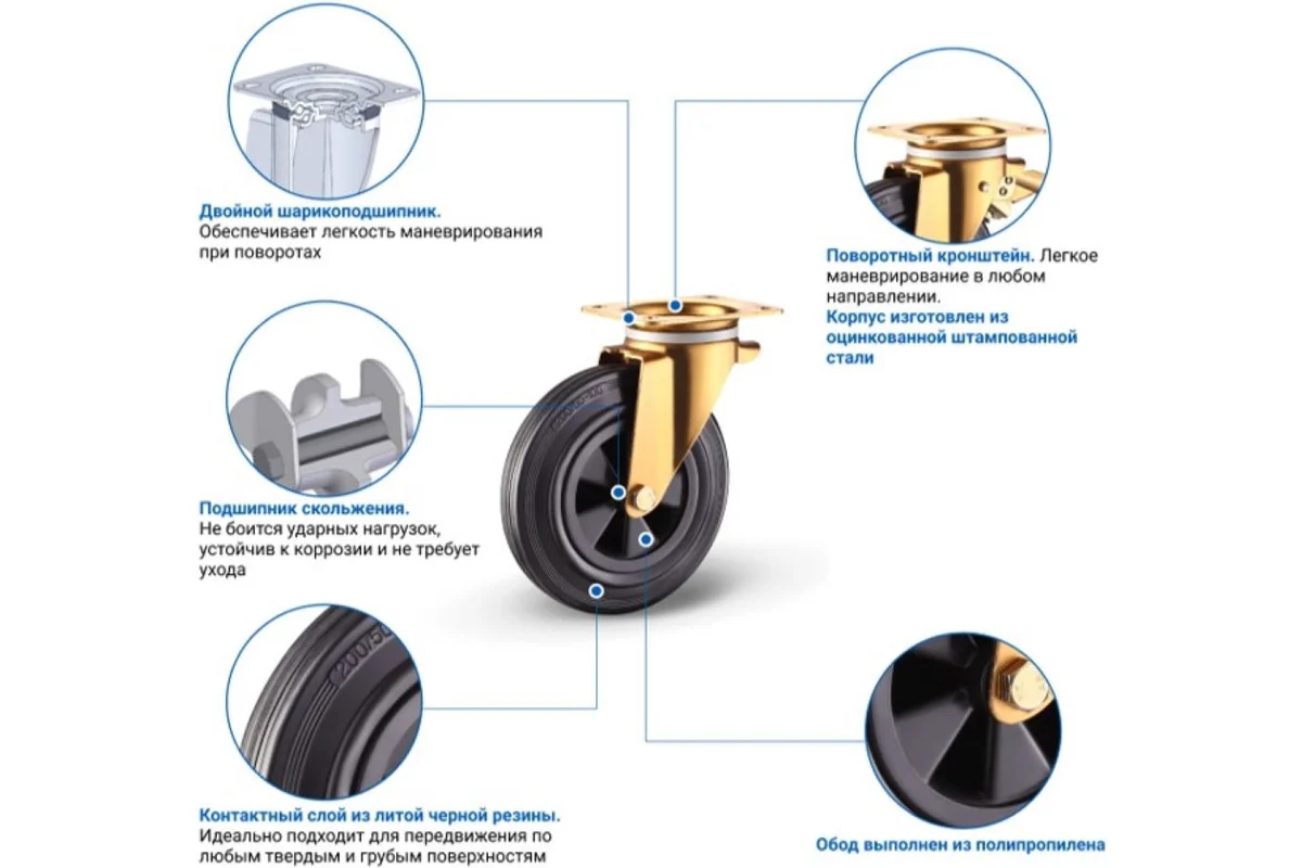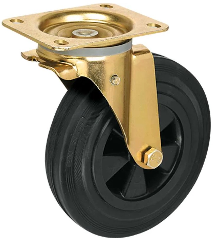 Колесо поворотное Дигрус ф160 ПКОу-Д 160 (D160) используется для установки на грузовые тележки на предприятиях общественного питания, торговли и пищевых производствах. Материал колес - резина, материал борта - прочный пластик, материал кронштейна - оцинкованная сталь.