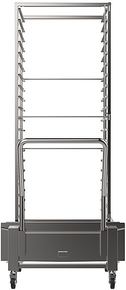 Тележка-шпилька Tecnoeka EKCR 20 TC используется совместно с пароконвектоматами MKF 2011 SMKF 2011 TSMKF 2011 BMEKF 2011 TC и EKF 2011 UD для хранения и транспортировки кондитерских противней, гастроемкостей и подносов с пищевыми продуктами и кондитерскими изделиями на предприятиях общественного питания, торговли и пищевых производствах. Модель со съемной ручкой и колесами с тормозами. Материал изготовления - высококачественная нержавеющая сталь.
