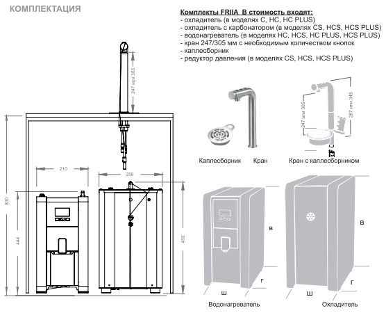 Система подачи холодной, горячей и газированной воды Marco FRIIA HCS используется в гостиничном бизнесе, спортивных и торговых центрах, образовательных учреждениях, в офисах и прочих местах общественного пользования для розлива холодной воды. Выдача воды осуществляется при помощи стильного, функционального настольного крана с кнопками, все технические элементы системы располагаются под столешницей. Комплектация системы: подстоечный охладитель с карбонатором, способный понижать температуру поступающей воды на 10°C, подстоечный нагреватель (объем 3 литра), кран с тремя кнопками выдачи воды, каплесборник и редуктор давления.