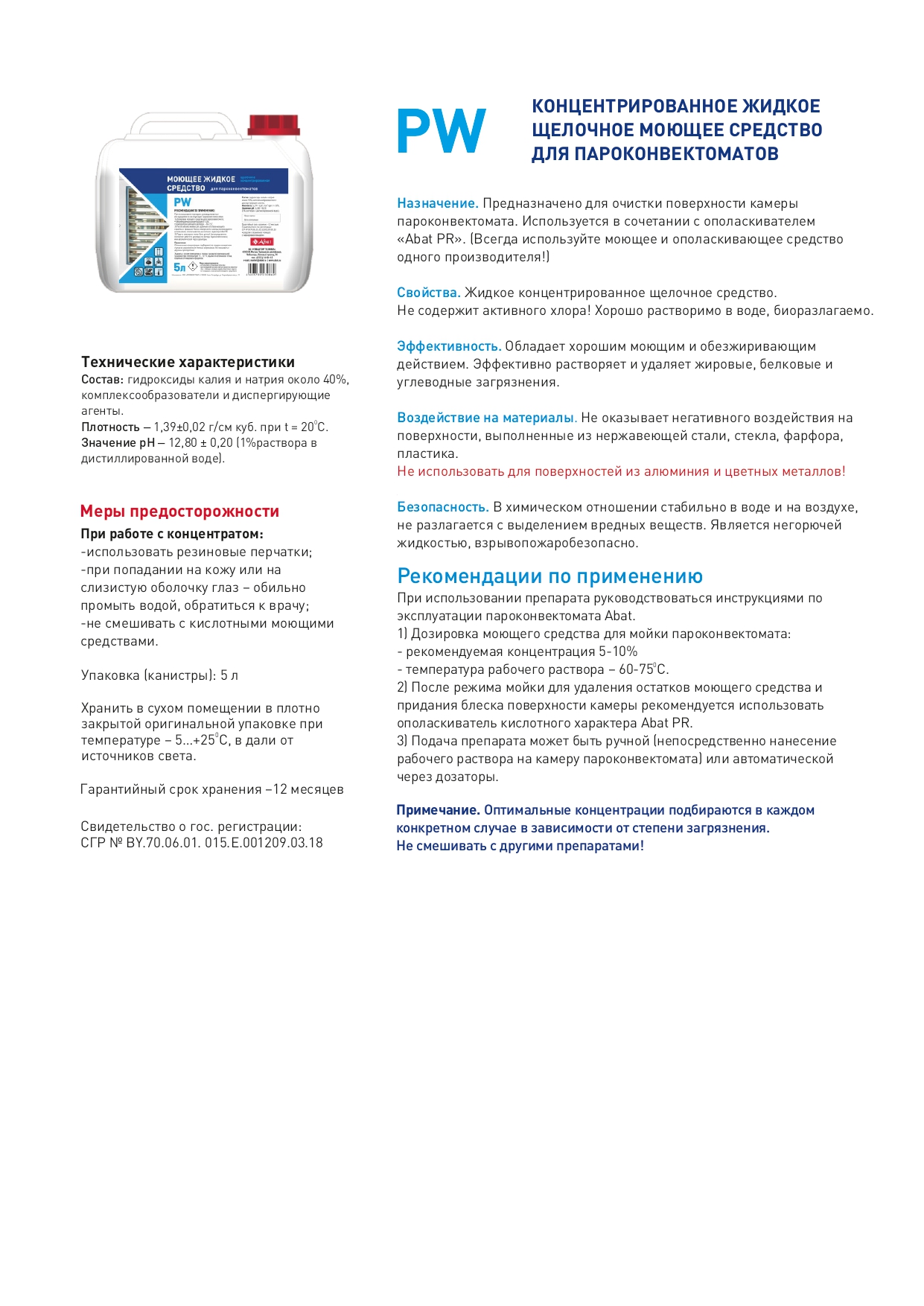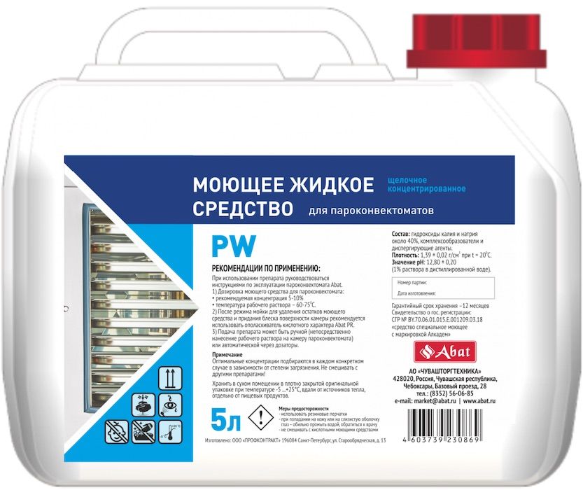 Концентрированное жидкое щелочное моющее средство Abat PW (5 л) предназначено для очистки поверхности камеры пароконвектомата.