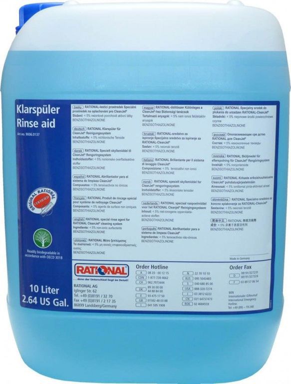 Ополаскивающее средство для пароконвектомата Rational CombiMaster предназначено для бережного и качественного ухода за готовочной камерой. В состав вещества, разработанного в лабораториях известнейшего в мире предприятия по производству профессионального пароконвекционного оборудования, входят только экологически чистые биоразлагаемые компоненты, одобренные всеми санитарно-гигиеническими службами Европы, России и стран СНГ. Ополаскиватель позволит гарантированно избавиться от остатков моющего средства.