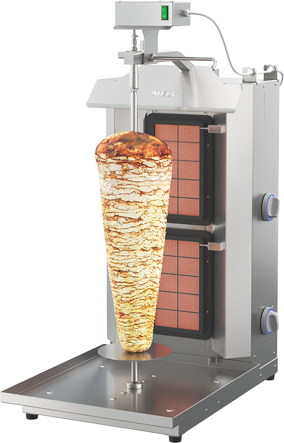 Газовый гриль ATESY Шаурма 2-Газ-05-Н предназначается для приготовления мясной начинки для шаурмы (шавермы) на предприятиях общественного питания и торговли. 2 газовые горелки беспламенного типа с возможность отдельного включения. Вращение ножа с мясом при помощи ручного привода с возможность установки электропривода ЭПШ-01 (в комплект не входит). Возможность регулировки расстояния между ножом и горелкой. Материал корпуса - нержавеющая сталь AISI 430.