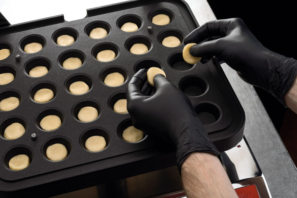 ТарталетницаPavoni NEWCOOKMATIC используется в пекарнях и кондитерских, на предприятиях пищевой промышленности и общественного питания для формовки и выпечки основ (тарталеток) из песочного и слоеного теста различной формы и размера. Модель оснащена электронным таймером со звуковым сигналом окончания цикла выпечки.