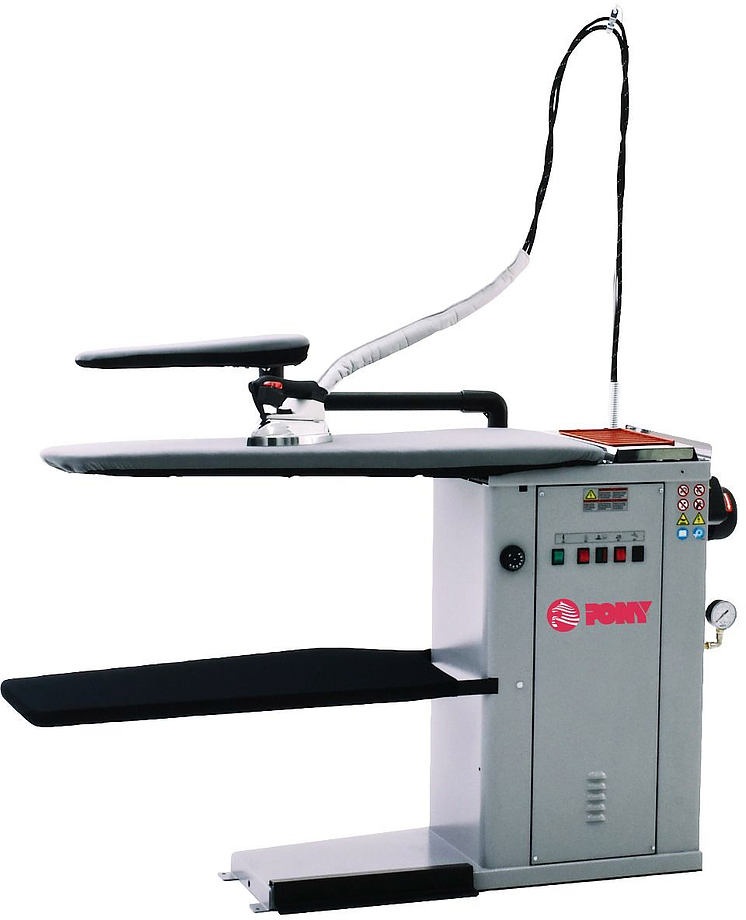 Гладильный стол PONY FVC используется в прачечных, производственных предприятиях, в медицинских учреждениях, гостиницах, детских садах, общежитиях для глажки белья с помощью утюга. Модель оснащена электрическим разогревом стола, паровым утюгом, аспиратором, автоматическим электрическим бойлером, вытяжной вентиляцией и утюгом.