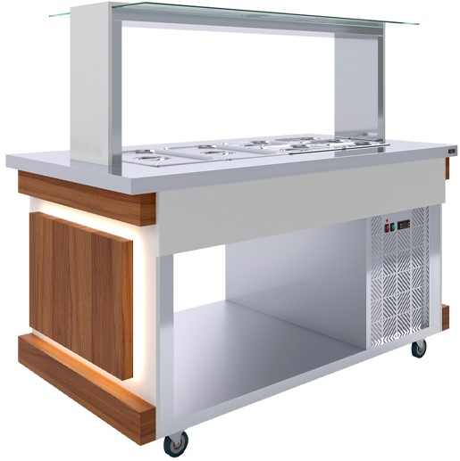 Салат-бар тепловой Luxstahl СБТ-1500 Premium предназначен для размещения в столешницы трёх электросупниц на предприятиях общественного питания, торговли и пищевых производствах в составе линий раздачи. Модель оснащена полкой и колесами для передвижения со стопорами. Материал изделия - высококачественная нержавеющая сталь.