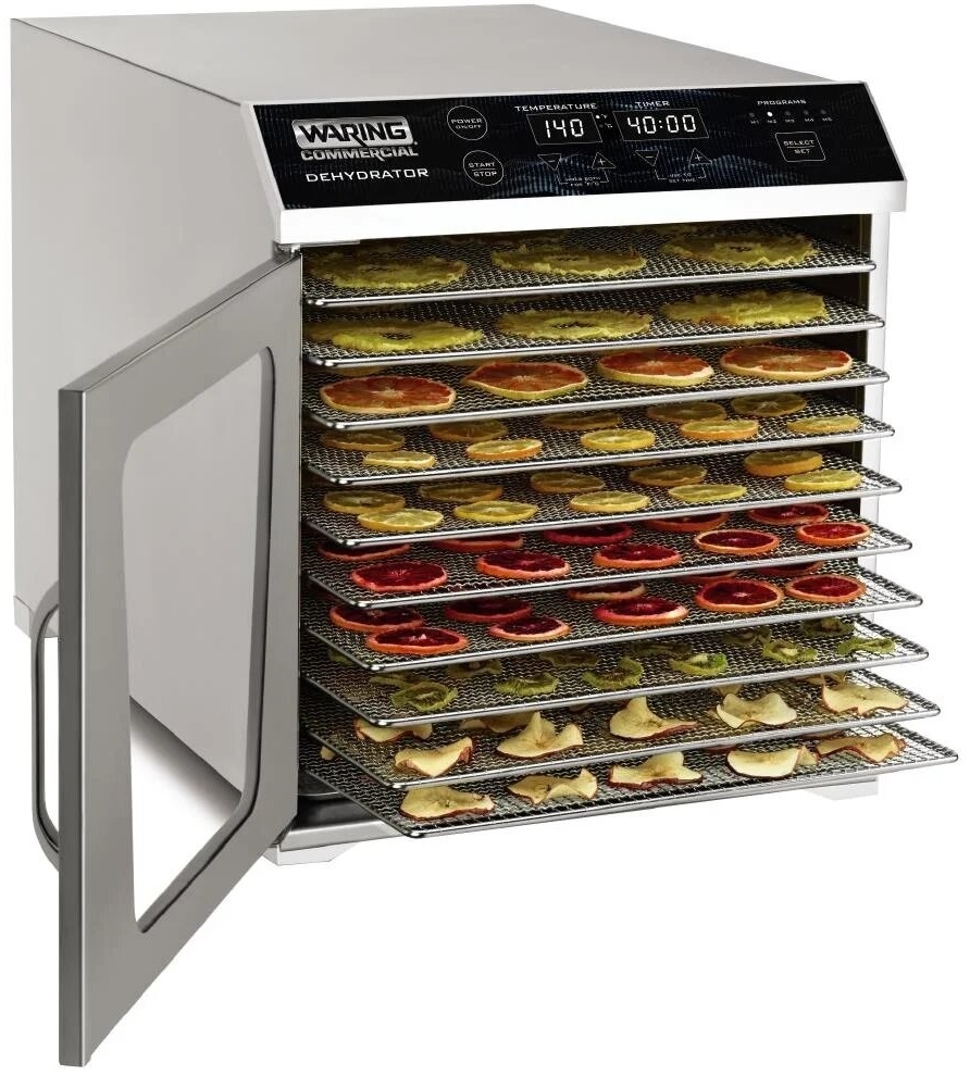 Дегидратор Waring WDH10E используется на предприятиях общественного питания, торговли и пищевых производствах для сушки овощей и фруктов. Модель оснащена электронным управлением, таймером, направляющими и распашной дверцей. Материал корпуса и сетки - высококачественная нержавеющая сталь, материал дверцы - закаленное стекло.