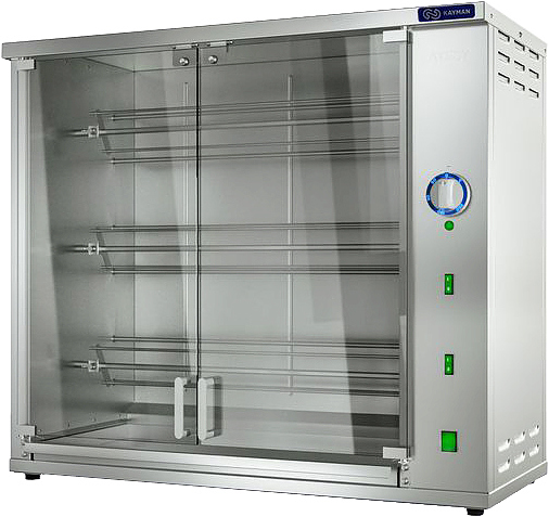Гриль для кур KAYMAN ГЭ-3Ш A предназначается для жарки тушек кур, цыплят, окорочков, грудок и прочей продукции на предприятиях общественного питания, торговли и пищевых производствах. Принцип работы заключается во вращении 3 съемных шампуров внутри рабочей камеры. ТЭНы инфракрасного излучения оснащены отражателем, что повышает эффективность нагрева продукта и располагаются на задней стене камеры. Гриль оснащен терморегулятором интенсивности нагрева. Материал корпуса - нержавеющая сталь AISI 430, материал дверей - ударопрочное закаленное стекло.
