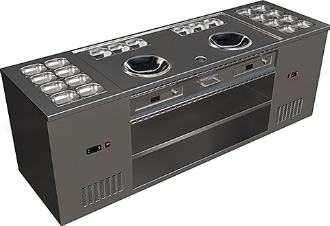 Станция WOK Astropit КС-ВОК-2605 используется на предприятиях общественного питания, торговли и пищевых производствах для разогрева и приготовления различных видов блюд. Модель оснащена 2 конфорками WOK, тумбой для инвентаря, 2 охлаждаемыми ваннами (вместимость каждой 8 емкостей GN 1/6 глубиной 150 мм) и 2 нейтральными ваннами (вместимость каждой 3 емкости GN 1/6 глубиной 150 мм) и емкостью для отходов. Две независимые панели управления с круговыми регуляторами и цифровыми дисплеями. Материал изготовления - нержавеющая сталь.