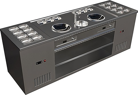Станция WOK Astropit КС-ВОК-2611 используется на предприятиях общественного питания, торговли и пищевых производствах для разогрева и приготовления различных видов блюд. Модель оснащена 2 конфорками WOK, тумбой для инвентаря, рукомойником, 2 охлаждаемыми ваннами (вместимость каждой 8 емкостей GN 1/6 глубиной 150 мм) и 2 нейтральными ваннами (вместимость каждой 3 емкости GN 1/6 глубиной 150 мм) и емкостью для отходов. Две независимые панели управления с круговыми регуляторами и цифровыми дисплеями. Материал изготовления - нержавеющая сталь.