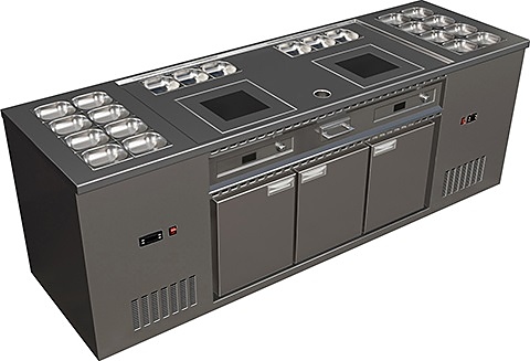 Индукционная кулинарная станция Astropit КС-ИНД-2604 используется на предприятиях общественного питания, торговли и пищевых производствах для разогрева и приготовления различных видов блюд. Модель оснащена 2 индукционными варочными зонами, 3 охлаждаемыми отделениями с распашными дверьми, 2 охлаждаемыми ваннами (вместимость каждой 8 емкостей GN 1/6 глубиной 150 мм) и 2 нейтральными ваннами (вместимость каждой 3 емкости GN 1/6 глубиной 150 мм) и емкостью для отходов. Две независимые панели управления с круговыми регуляторами и цифровыми дисплеями. Материал изготовления - нержавеющая сталь.